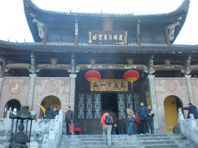 真身寶殿,俗稱“肉身殿”,又稱“肉身塔”,坐落在九華山神光嶺(老爺頂)上,為佛教徒朝謁九華圣地的主要場(chǎng)院所,這里因主供地藏菩薩,故與一般佛寺不同。九華山肉身殿是典型的宮殿建筑,殿高15米,門朝西南。入殿須登八十一級(jí)臺(tái)階,站在臺(tái)階之下,舉目仰望,可見南門廳上兩塊匾額:上額書“肉身寶殿”,下額書“東南第一山”。大殿四周回廊上方雕梁畫棟,仙鶴、麋鹿等珍禽異獸,牡丹、靈芝諸鮮花奇草。