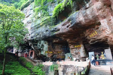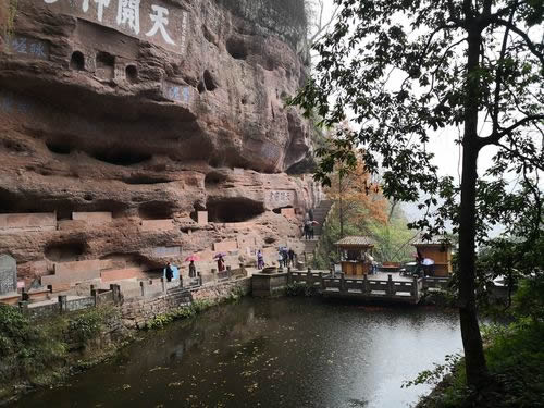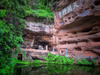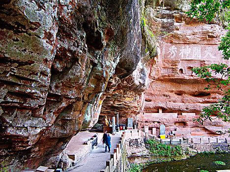 真仙洞府:過(guò)天門(mén)巖,下石階即達(dá)。這里危崖三彎折,相連如城垣。巖下通道沿砌石欄桿,欄外為碧蓮池,共構(gòu)一“叵”字形;崖間洞窟累累,依次有八仙洞、觀音洞、真仙洞(羅漢洞)、雨君洞、文昌洞、白馬洞、珠簾洞,就洞建宮宇,祀道教各路神仙,統(tǒng)稱(chēng)真仙洞府。崖壁、摩崖題字石刻,如“天開(kāi)神秀”、“齊云勝景”等多達(dá)近百處。
