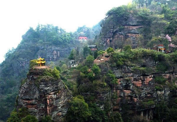洞天福地:位于望仙亭東南,又稱(chēng)桃源洞天。后倚丹崖?lián)泶氐恼拐a峰,前臨涓涓流淌的桃花澗。明代建有洞天福地祠、斗姆閣、寥陽(yáng)殿、青羊?qū)m,三元宮、桃源洞天亭等建筑,今圮;僅存八卦池、邋遢仙墓、仙人床及宮、閣、殿祠遺址。