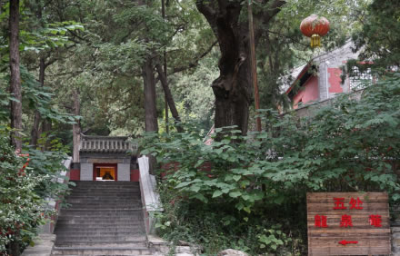 出秘魔崖,沿證果寺門前小盤道下行至南面水井,此處樹(shù)木成林,茂密非常,且均高大參天。日出東坡,光照林梢之時(shí),愈發(fā)覺(jué)得明暗濃淡別有意趣。唐詩(shī)所詠:“清晨入古寺,初日照高林”似不啻此處之景。