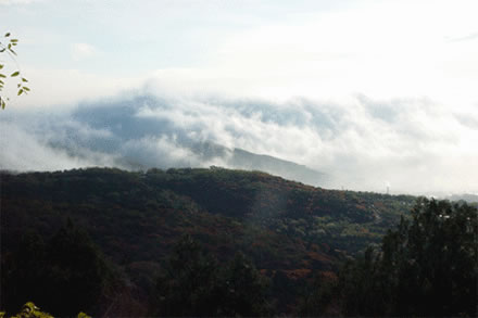 仲夏清晨,雨后天氣濕潤(rùn)時(shí),?梢(jiàn)如素如練的云霧飄浮于三山之腰,似斷還連的畫(huà)中之境。注目靜觀,或自峰后繞于嶺前,或從石隙游出升騰;有時(shí)凝固不甚流動(dòng),有時(shí)行走又很疾速。翠微山、虎頭峰間凝然不動(dòng)者居多,盧師山青石黛樹(shù)中則流走如飛者眾。概山勢(shì)高低不同所致。