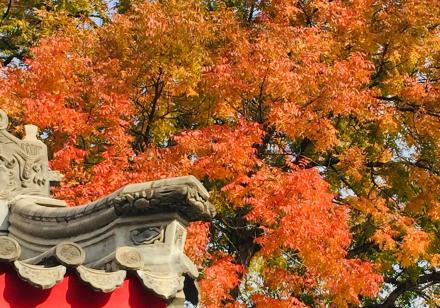 此為八大處一大勝景。霜秋一到,三山之上的黃櫨樹(shù)、火炬樹(shù)、元寶楓以及柿子樹(shù)、核桃樹(shù)和山花椒等等,黃時(shí)薄山碎,金迎風(fēng)閃爍,紅時(shí)又如二月鮮花處處流丹。有橡樹(shù)、青松翠柏,赤橙。