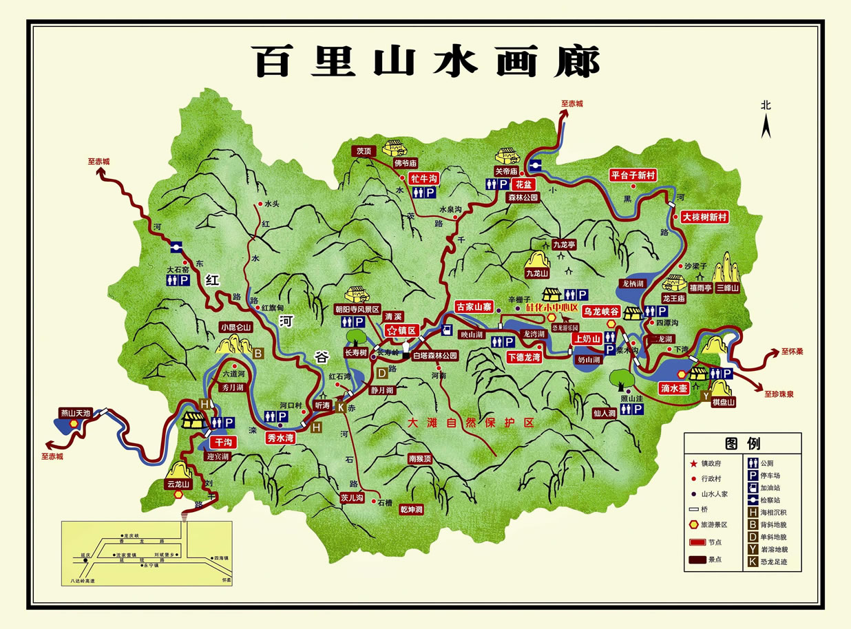 北京延慶百里山水畫廊景區(qū)位于延慶區(qū)東北部千家店鎮(zhèn)中國(guó)延慶世界地質(zhì)公園千家店園區(qū)內(nèi),屬延慶生態(tài)涵養(yǎng)區(qū)的核心區(qū),總面積371平方公里,距縣城40公里,距北京市區(qū)110公里。東與懷柔區(qū)毗鄰,北與河北省赤城縣接壤,西南、東南分別于香營(yíng)、劉斌堡、珍珠泉三個(gè)鄉(xiāng)相連。灤赤、花千、花沙公路穿鎮(zhèn)而過自成環(huán)線,交通便利。