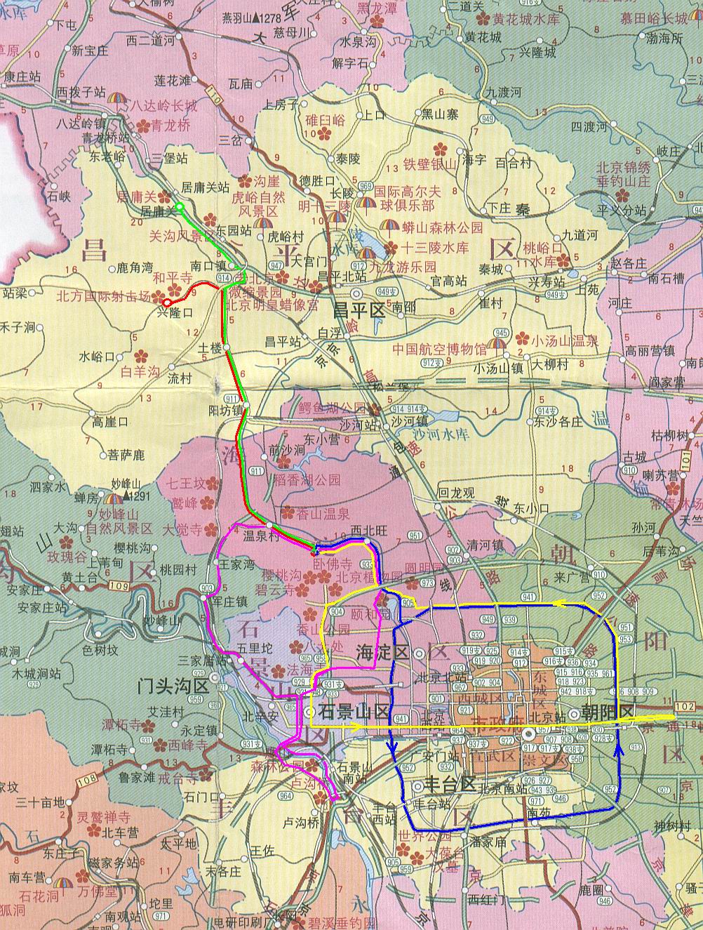 。。有著明顯四季更迭變化的北京,將時刻為您帶來美的感受。春的柔順與明麗,夏的嫵媚與多情,秋的成熟與風(fēng)韻,冬的純潔與晶瑩。她豐富的地貌特征,讓您穿林越谷,感受漂流與攀巖的刺激。在北京熙來攘往的城區(qū)之外,不出幾十公里,便是一派田園風(fēng)貌:數(shù)條河流縱情奔淌,千道峽谷雄奇幽深,崇山峻嶺云霧繚繞,密林草甸空氣清新,更有讓人魂牽夢繞,永不厭倦的莽莽長城……娛樂項目更是花樣翻新:登山探險、野炊宿營、驅(qū)車越野、徒步旅行、策馬揚鞭、水中怡情等等,無論您是滑山(滑道)、滑水、滑冰、滑草亦或是滑雪,無論您想游水、游街、游空氣(滑翔傘、蹦極),總之,只要您是想不留下終身憾事,那就快來吧!北京的八個城區(qū)和十個遠(yuǎn)郊區(qū)縣,時刻等待您的光臨!