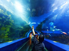 從南中國海下潛,經(jīng)過西太平洋、印度洋、紅海、地中海、到大西洋,海底隧道色彩斑斕的水中視覺效果,超大弧形亞克力膠展示窗掀開大海神秘的面紗。37個展缸向游客展示了地球上最具代表性海域的觀賞魚類。