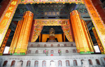 大雄寶殿:在天王殿后面,坐落在近兩米高的月臺(tái)上。門額上高懸清乾隆帝手書(shū)“蓮界香林”雕龍橫匾。原來(lái)還掛有清康熙帝所題“般若無(wú)照” 匾額和“禪心似鏡留明月,松韻如莫振舞風(fēng)”的楹聯(lián),今已不存。殿內(nèi)屋頂上有三個(gè)木雕藻井,上圓下方,井內(nèi)各雕有一條團(tuán)龍。下方漢白玉石雕的須彌座上供有明代鑄造的銅質(zhì)橫三世佛。正中為釋迦牟尼佛,南側(cè)為阿彌陀佛。北側(cè)為藥師佛。每尊佛像高3.2米,重5000公斤。大殿前左右兩側(cè)各有三間配殿,左側(cè)為伽藍(lán)殿,右側(cè)為祖師殿。