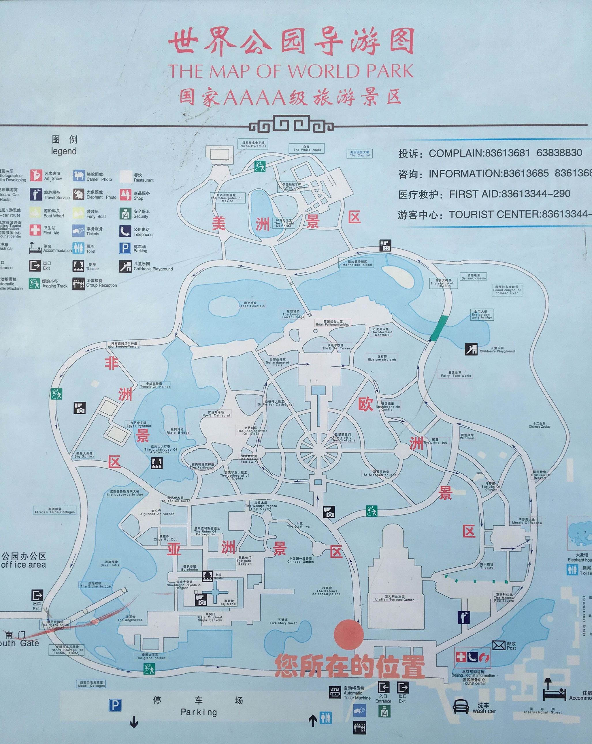 步入公園大門,迎面便是寬闊壯麗的意大利臺(tái)地園,然后順時(shí)針方向進(jìn)入亞洲景區(qū),首先見到日本的桂離宮,依次是中國園林清音境、萬里長(zhǎng)城、莫高窟、應(yīng)縣木塔,還有波斯波利斯宮遺址(伊朗)、婆羅浮圖(印度)、巴比倫門(伊拉克)、泰姬陵(印度)、仰光大金塔(緬甸)、吳哥寺(柬埔寨)、泰國大王宮;然后跨過悉尼鐵橋進(jìn)入“澳洲”,可以觀賞毛利草屋(新西蘭)、悉尼歌劇院(澳大利亞);接著進(jìn)入“非洲”沙漠,巡看非洲部落、獅身人面像(埃及)、吉薩金字塔(埃及)、阿布·西姆貝爾神殿(埃及)、卡納克神廟(希臘)和亞歷山大燈塔(埃及);超過博斯普魯斯海峽大橋,就進(jìn)入到“歐洲”,可以欣賞到特洛伊木馬(土耳其)、圣·索菲亞大教堂(烏克蘭)、雅典衛(wèi)城(希臘)、羅馬競(jìng)技場(chǎng)(意大利)、比薩斜塔(意大利)、圣·彼得大教堂(俄羅斯),便游到公園中心凱旋門(法國),依次游布直塞爾第一公民景點(diǎn)(比利時(shí)),德國城堡、埃菲爾鐵塔(法國)、巴黎圣母院、大本鐘(英國);漫步倫敦塔橋,便進(jìn)入“美洲”,依次可以看到美國的宇航中心,林肯紀(jì)念堂、華盛頓紀(jì)念碑、白宮、國會(huì)大廈、紐約曼哈頓區(qū)和自由女神像,穿過科羅拉多大峽谷(美國),邁過金門大橋(美國),便到了十二生肖像,看到荷蘭風(fēng)車,又可贍仰德國音樂家肖邦像和莫扎侍像,還可看到“華沙 美人魚”,最后到達(dá)“莫斯科紅場(chǎng)”。漫游“世界”一周后,再到“國際街”購物、小吃、休憩,感嘆世界真奇妙不看不知道。