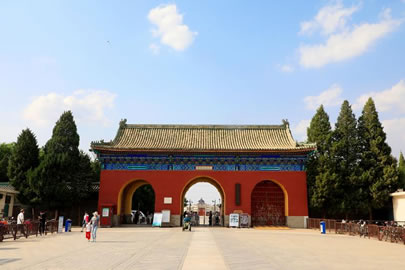 無梁殿:即齋宮正殿,建于明永樂十八年(1420年)。此殿因以磚拱承重,不用梁枋而得名;实圻M(jìn)出齋宮均在此舉行有關(guān)禮儀。現(xiàn)殿內(nèi)按乾隆時(shí)期原貌陳列,橫額“欽若昊天”為乾隆御筆,屏風(fēng)、寶座均為原物。