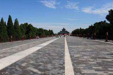 丹陛橋長360米,是連通圜丘壇和祈谷壇的一條高出地面4米的大道。大道中部下有東西向券洞通道,故名橋,是北京最古老的“立交橋”。橋面寬30米,中間石板大路為“神路”,供天帝專用;東側(cè)磚砌路面稱“御路”供皇帝專用,陪祀王公大臣只能在西側(cè)的“王路”上行走,上下進(jìn)退等級(jí)分明。丹陛橋北高南低,北行令人步步登高,如臨天庭。