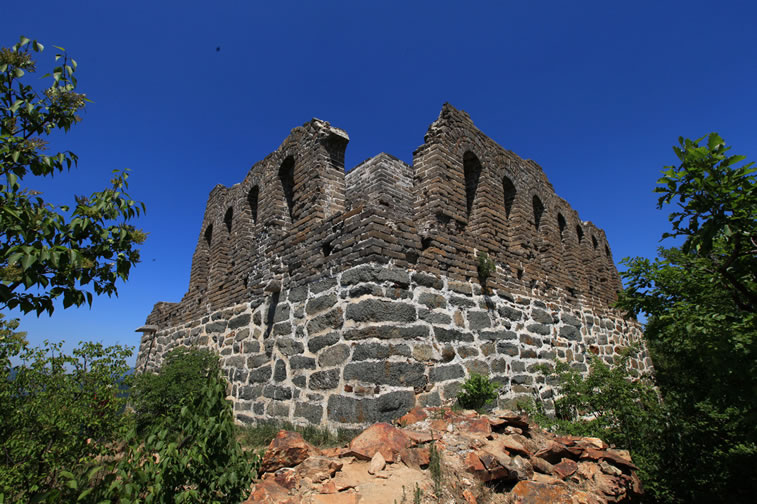 九眼樓長城 九眼樓長城位于四海鎮(zhèn)火焰山頂部。因敵樓每面有9個箭窗,故名。又因山勢高峻,晴天可望到北京城,故也稱望京樓。為長城重要關(guān)口之一。海拔1141米。現(xiàn)樓內(nèi)有灶炕、居室遺跡,近處有馬場、晾馬場、軍營(營城)遺跡。樓北側(cè)有明代官員徐申于萬歷十三年(公元1585年)巡行到該地書寫的大理石碑一方。 九眼樓為正方雙層建筑,因每邊有九個了望孔而得名,現(xiàn)存一層,高度為7.8米,每邊為13米,了望孔高1.65米,寬0.5米,內(nèi)有軍士來往巡視寬1.2米的環(huán)行步道。九眼樓下部砌石條,上部用白灰砌青色城磚,構(gòu)建十分堅(jiān)固而壯美。樓下西側(cè)有小平臺,為軍士集中的場地。平臺北側(cè),有磚砌的臺階,沿臺階可達(dá)樓南門。樓頂為磚砌券拱式結(jié)構(gòu),樓內(nèi)寬大,可住兵儲器,向北開兩窗,四面各有一門,門高兩米,闊1.2米,出入極便利。 |