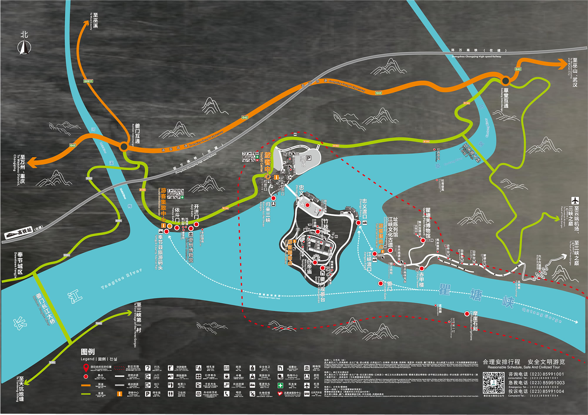 白帝城·瞿塘峽景區(qū)總面積4.7平方千米,主要由白帝城、瞿塘峽兩大景區(qū)構成,名勝古跡眾多,融自然與人文、詩情與戰(zhàn)火為一體,是飽覽長江三峽壯麗之美的起點。白帝城擁有多座城門,發(fā)現(xiàn)的有東門、小北門、大北門、皇殿臺甕城門(桑閤門)、小西門、西門等,白帝廟內有明良殿、武侯祠、觀星亭等明清建筑。 瞿塘峽緊鄰白帝城,全長8千米,集雄、奇、險、峻為一體,是三峽中最短、最窄、最險的一段峽谷。瞿塘峽內北岸赤甲山上有老關廟文化遺址、大溪文化遺址、巫山猿人遺址三大遺址和老關廟信號臺、赤甲樓、古炮臺、古棧道、風箱峽懸棺等景點;南岸白鹽山有孟良梯古棧道遺跡、摩崖石刻、犀牛望月峰、猿人峰等景觀,濃縮了中國200萬年的人類發(fā)展史。