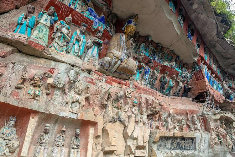大足石刻分布于該縣西南、西北和東北的扇區(qū),共23處。較集中的有寶頂山、北山等19處。其中以寶頂山摩崖造像規(guī)模最大,造像最精美。除佛像和道教造像外,也有儒、佛、道同在一龕窟中的三教造像,而以佛教造像所占比例最大。