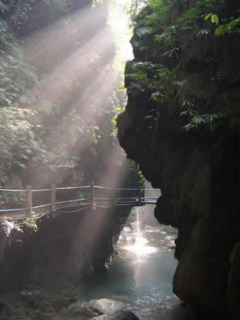 其實(shí)藏刀洞乃是一座橫臥于峽中的自生橋。洞口兩側(cè)懸崖峭壁、鬼斧神工,它高50余米、寬處10余米、窄處7—8米、長(zhǎng)約45米,地質(zhì)構(gòu)成甚為奇特。該洞是由于億萬(wàn)年前的地殼運(yùn)動(dòng)形成的溶洞,洞內(nèi)長(zhǎng)年在二氧化碳流水的作用下,形成了藏刀洞,用手輕輕一摸,上億年時(shí)光便從指間悄悄滑過(guò)。 |