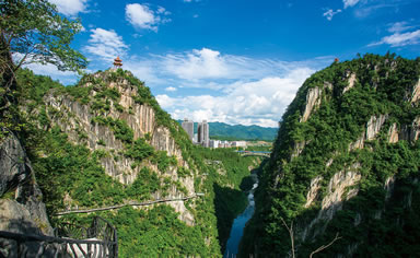 城市大峽谷,因其貫穿黔江老城和舟白、正陽新城三大城市組團(tuán),集城市大峽谷、城市大峽江、城市大溶洞于一體,是世界上罕見的“城市峽谷峽江”景觀。城市大峽谷地貌奇特。橫跨七個(gè)地質(zhì)年代,兼具喀斯特、礫石、丹霞等地貌特色,峽谷兩岸懸崖絕壁,森林植被茂密,溶洞密布,峽谷長10公里、平均深度200米、垂直落差500米。潺潺流淌的黔江河水穿峽而過,刀砍斧削的峽壁長滿蒼松古樹,如水墨山水畫,峽頂峰巒起伏,松林蔥郁。峽中洞穴密布,洞洞相連,洞中有洞,曲折如同迷宮一般,是大武陵唯一的集峽谷江流、峽谷城市、峽谷體驗(yàn)、峽谷文化于一體的奇幻景觀。城市大峽谷景致雄壯,有觀音峽、白虎峽、龍脊崗石林等自然景觀,擁有大世界基尼斯之最——高達(dá)123米的巨幅摩崖觀音像;有驚險(xiǎn)絕倫、垂直高度逾300余米的懸崖絕壁棧道;有奕孝亭、柳孝亭、觀音雕像、摩崖石刻等人文景觀;有回音壁、慈航橋等驚奇美妙的體驗(yàn)。蜿蜒的峽谷峽江、原始的峽谷風(fēng)光、濃郁的武陵廟堂在此融為一體。