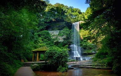 水口寺瀑布高94.18米,寬30米,最大的流量為每秒120多立方米,是四面山第四大高瀑。觀水口寺瀑布可經(jīng)過棧道到達瀑布背面平視瀑布,可從“九道拐”走下818步石梯于底端仰望瀑布。坐石觀景,四周奇石嶙峋,入目銀瀑飄飛,腳下流水潺潺,半山古樹盤扎。