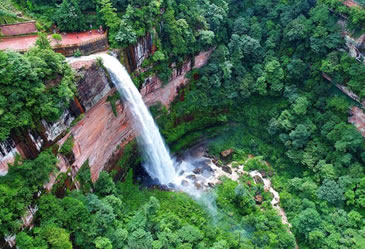 土地巖瀑布在土地巖壁畫對面,如一潔凈的白緞懸垂而下。瀑布高89米,寬25米,懸垂于綠樹紅巖之中,三面赤壁環(huán)繞,與巨幅丹霞赤壁兩相呼應,形成四山鎖絕谷、一水落幽林、綠樹映湖色、丹霞醉畫屏的絕景。