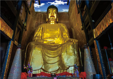 重慶市潼南縣城西北1.5公里定明山下。唐咸通年間(860-874年)始建,初名南禪寺,宋賜額定明院,今俗稱大佛寺。寺依山崖凌空而立,廟高33米,梯臺(tái)狀,佛閣七層,層層飛檐高翹,皆覆琉璃瓦。崖壁鑿雕釋迦牟尼坐像,高達(dá)27米,頭像為唐咸通年鐫刻,佛身為宋靖康二年(1127年)續(xù)刻。頭飾螺鬢,袒胸,著雙領(lǐng)下垂外衣,左手壓膝,右手置腹前,全身飾金。