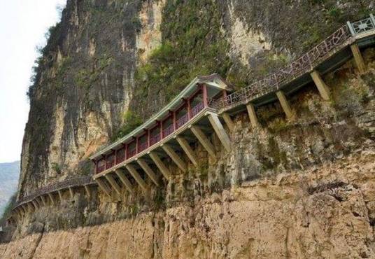 大寧河古棧道遺跡,上下孔眼交錯成倒“品”字,上排兩孔插木樁,鋪木板,下孔插木柱斜撐木板,構成三角形支撐架,從而修筑成供人畜行走的“棧道”。 古棧道以寧河為主干,從龍門峽口,經巫溪縣延伸到陜西的鎮(zhèn)平縣、湖北溪縣、重慶城口縣一帶。寧河棧道總長約400多千米,其長度超過著名的劍閣棧道,為我國古棧道遺跡中所少有。