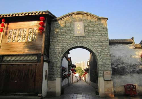 衣 錦坊是“三坊”中的第一坊,舊名通潮巷。據(jù)清《榕城考古略》記載:宋朝的“陸蘊(yùn)、陸藻兄弟典鄉(xiāng)郡居此,名祿錦,后王益祥致江東提刑任,更名衣錦!彼螘r(shí)稱“祿錦”,明朝更為“衣錦”,其實(shí)都是說(shuō)坊內(nèi)有人在外出仕做大官,之后衣錦還鄉(xiāng),榮耀鄉(xiāng)里,所以坊名也改為了“衣錦”。過(guò)去稱“通潮”,則是因?yàn)檫@個(gè)地方是水網(wǎng)地區(qū),福州西湖、南湖的潮水可以通到這個(gè)坊巷的溝渠里去。坊中16號(hào)為清嘉慶進(jìn)士鄭鵬程居宅,其中的衣錦坊水榭戲臺(tái)最具特色。這是一個(gè)木構(gòu)單層平臺(tái),四柱單開(kāi)間,下建清水池塘,中隔天井,正面為閣樓。于此觀看戲劇演出,水清、風(fēng)清、音清,具有聲學(xué)原理和美學(xué)價(jià)值,是福州市現(xiàn)存的水榭戲臺(tái)。