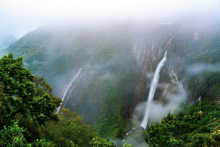 景區(qū)內岱仙瀑布總落差約314米,單級落差184米,雄偉壯觀,被譽為“華東第一瀑”。晴天,陽光直射,水簾發(fā)光,彩虹若隱若現(xiàn),似巨幅珠簾下垂,像彩綢飛舞,蔚為壯觀。