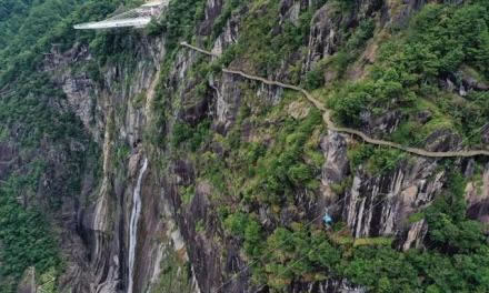 心形懸崖棧道位于岱仙瀑布兩側,從遠處看,兩邊的棧道整體呈一個心形,蜿蜒盤桓在崖壁上,心形棧道全程3000米,高差314米,是國內難得一見的心形立體環(huán)瀑棧道。