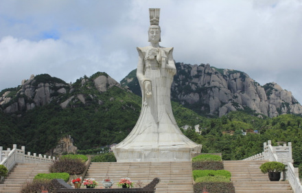 太姥娘娘雕像左邊是烏龍崗,右邊是虎頭崗,前眺東海,幜袓u,背靠摩霄峰。雕像由288塊花崗巖組成,疊高18層,高20.88米(含基座),臺(tái)階的臺(tái)數(shù)、級(jí)數(shù),都暗合道教所推崇的數(shù)字“九”。雕像造型方中有圓,以方為主,吸收了北魏石窟雕像的秀骨清相的特點(diǎn),揉進(jìn)少許盛唐時(shí)代人物面部的豐潤(rùn),同時(shí)又從漢俑中吸取單純簡(jiǎn)潔之韻味。