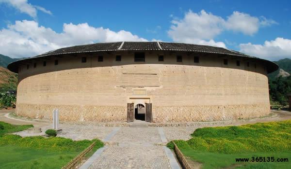二宜樓:這座被譽(yù)為"國之瑰寶"的圓土樓,座落在華安縣仙都鎮(zhèn)大地村。仙都、大地,這是多么富有詩意的名字,其實(shí)二宜樓就是人間天堂的一座民居,就是中華大地的一顆璀璨明珠。 二宜樓依山傍水,樓后峰巒疊嶂,近處山丘綿延,猶如蜈蚣緩緩爬行(風(fēng)水先生稱之為"蜈蚣吐珠地");兩條清澈的小溪在樓前交匯后,直奔西南而去。青山綠水,與黃墻黑瓦交相輝映,小橋、樓閣、翠竹、村舍點(diǎn)綴其間,渾然一體,正是"宜山宜水"的一派旖旎風(fēng)光。樓內(nèi)祖廳便有一對(duì)柱楹,專門概述這一景觀:"倚杯石而為屏,四峰拱峙集邃閣;對(duì)龜山以作案,二水瀠洄萃高樓。" 所謂宜山宜水,其實(shí)還隱寓樓主蔣仕熊排行第二,又是第二次擇地,才選中這蜈蚣吐珠穴位,其得意之情溢于言表。在族人的傳說里,蔣仕熊年輕時(shí)是個(gè)種田能手,他身材高大,體格健壯,臂力超人,能使一把廿四斤重的大刀,可惜他人才超群,卻遲遲未能成家,說是犯了"孤鸞命",注定一輩子打光棍。族人背地里取笑他說:"無某(妻)無猴,鎖匙掛褲頭。"他一氣之下出走他鄉(xiāng),到安溪、漳平等地開墾荒田幾百畝。不久,他遇到了一個(gè)魏氏姑娘,兩人婚配后,生了六個(gè)兒子。蔣仕熊晚年衣錦返鄉(xiāng),開始投巨資建樓,由于操勞過度,他在二宜樓尚未建成時(shí)便不幸逝世,他的六個(gè)兒子、十七個(gè)孫子繼承遺志,艱苦努力,終于在清乾隆35年(1770年)把大樓建成。