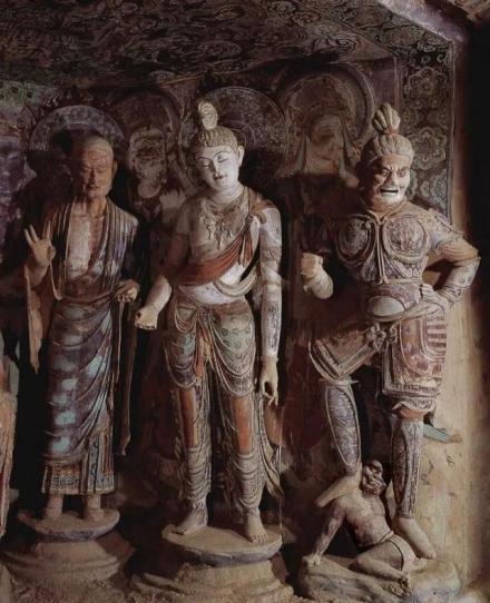(1)早期——發(fā)展期,包括十六國(guó)、北魏、西魏、北周四個(gè)時(shí)代,歷時(shí)一百八十年。早期洞窟形制有三:1.禪窟,塑像在正龕。2.方形或長(zhǎng)方形殿堂窟,塑像置于正龕或南北壁列龕內(nèi)。3.中心柱窟,塑像置于長(zhǎng)方形柱四面之龕內(nèi)。從佛像類別上分,有彌勒像、釋迦像和釋迦多寶并坐像,以表現(xiàn)的事態(tài)分,有說(shuō)法像、禪定像、思惟像。中心柱四面多為苦修、禪定、降魔、成道等像,主尊兩側(cè)多有侍從菩薩,形成一佛二菩薩的格式。早期彩塑多以彌勒為主尊,這與當(dāng)時(shí)傳自西域的彌勒信仰有密切關(guān)系。