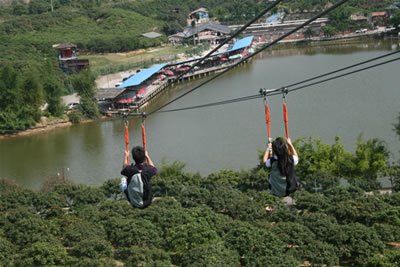 空中飛人滑索項(xiàng)目位于觀音廟后,依山勢而建,在果樹山林之間架起了一段全程300米、落差50米,每秒7.5米滑行速度的高空索道,在歷時40秒滑行時間中,游客在享受高空索道帶來驚險(xiǎn)刺激體驗(yàn)同時,可一覽園區(qū)秀美風(fēng)景并,讓人回味無窮。