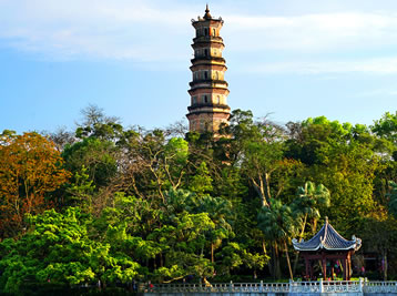 泗洲塔位于廣東惠州西湖西山,是湖上最古老建筑物。始建于唐中宗年間,為紀念泗洲大圣僧伽而筑,北宋文學家蘇軾謫居惠州時稱之為大圣塔。明嘉靖四十三年(1564年)塔毀,明萬歷初年改建亭,明萬歷四十六年(1618年)復建塔。光緒初年,雷破塔頂一角,長了一株榕樹,清代愛國詩人丘逢甲詩云:“行人欲問朝云墓,看取亭亭塔頂榕”。山上綠樹成蔭,亭廊排映,景色秀麗。蘇東坡寫的《江月五首》“一更山吐月,玉塔臥微瀾”的著名詩句指的正是此塔。泗洲塔明代后建至今,已有整整403年古老歷史,是惠州現(xiàn)保存最完善古老的珍貴建筑物之一;葜葶糁匏粡V東省人民政府批準并公布為第八批廣東省文物保護單位。