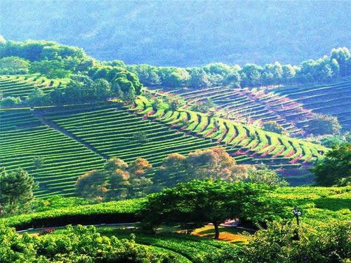 雁南飛茶田是飽蘸著祖國茶文化,在青山綠水間濃墨重彩揮灑而就的融茶葉生產(chǎn)、加工與旅游、度假于一體的山區(qū)“三高農(nóng)業(yè)”、“生態(tài)農(nóng)業(yè)”、“旅游農(nóng)業(yè)”的開放型旅游景區(qū),被譽為“現(xiàn)代農(nóng)業(yè)開發(fā)的成功范例”,梅州“三高農(nóng)業(yè)”開展的一個樣板和典范。雁南飛茶田在茶葉種植的同時結(jié)合了果樹的種植和園林綠化,大片的茶樹與龍眼、荔枝、芒果、枇杷等南國佳果、各式園林綠化景點相隔其中競相媲美。雁南飛茶田在科學(xué)種植的同時,采用傳統(tǒng)工藝結(jié)合現(xiàn)代高新技術(shù),精制出有獨特自然香型的雁南飛高級系列茗茶,并賦于濃厚的文化內(nèi)涵和高附加值,創(chuàng)造了名牌精品。雁南飛茗茶主要有:金單叢烏龍茶、自然香烏龍茶、金桂蘭烏龍茶、人參烏龍茶、金觀音烏龍茶、桂花烏龍茶,此外還有特制的茉莉花綠茶、映山紅紅茶等品種,適合不同品味的人士品茗。
