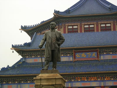 矗立在紀(jì)念堂前正中央的孫中山銅像。1956年,由雕塑家尹積昌等人創(chuàng)作的水泥像(表面鍍銅,1998年后才更換銅像)。高5.5米,重3.9噸,所鑄是孫中山先生在中山大學(xué)演講時的造型。銅像下白色花崗巖的基座上刻著孫中山先生所著《建國大綱》的內(nèi)容。