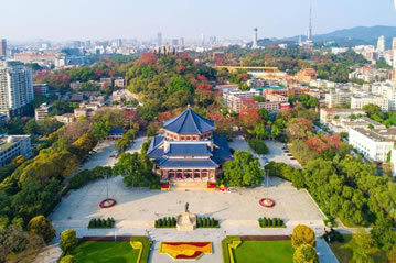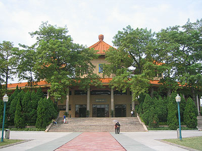 從空中俯視,紀(jì)念堂呈外突的傘型結(jié)構(gòu),青磚藍(lán)瓦藍(lán)象征著孫中山先生當(dāng)年。