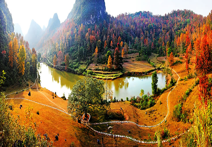 紅葉森林公園位于德?h東北側(cè)方向,國家AAAA級旅游景區(qū)暨自治區(qū)級森林公園,距縣城3.5公里,交通便利。公園規(guī)劃面積1036.5公頃,該公園核心景區(qū)為紅楓湖游覽區(qū)和紅葉谷游覽區(qū),以紅楓為主題。金秋時(shí)節(jié),楓葉似火,湖水輕柔,互襯互耀,頗具詩情畫意。公園的紅葉品種主要以楓香為主,葉子顏色分別有深紅、絳紅、霞紅、黃紅混合等,觀賞時(shí)間較長,有著“德保楓葉賽九寨”的美譽(yù),是秋季里一道亮麗的風(fēng)景線。公園以紅楓湖、紅葉谷一帶的紅楓林為依托,襯托著多姿多彩的紅葉森林景觀、森林生態(tài)景觀、底蘊(yùn)深厚的人文景觀和綺麗迷人的水文景觀,將紅楓湖、上章湖、紅葉谷構(gòu)成休閑避暑游覽的大旅游圈,景區(qū)內(nèi)上章水庫和百布水庫交相輝映,總庫容量分別為365萬立方米和190萬立方米;有效灌溉面積分別為2200畝和2000畝。目前,景區(qū)各項(xiàng)基礎(chǔ)設(shè)施正在逐步完善。德保境內(nèi)有10萬多畝連片的紅楓林,遍布城關(guān)、那甲、馬隘、巴頭等鄉(xiāng)鎮(zhèn)。除紅葉森林公園外,馬隘至巴頭一線還有許多別具特色的賞楓景點(diǎn),無一不令人流連忘返。