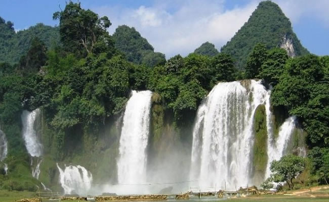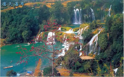 德天瀑布雄奇瑰麗,變幻多姿,碧水長流,永不涸歇。瀑布四季景色不同,春天凌草泛青,山花吐艷,瀑布四周被鑲起五彩繽紛的花邊;秋天梯田鋪金,層林盡染,高掛的銀簾霧氣沖天;冬天瓊珠閃閃,玉液潺瀑,山風(fēng)把細流吹得飄飄灑灑;夏天激流如 龍,排山倒海,似萬馬奔騰而來。