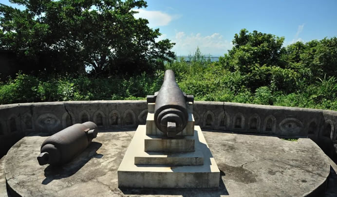 白龍古炮臺位于防城區(qū)江山鄉(xiāng)白龍尾半島南端,由“白龍臺”、“銀坑臺”、“龍珍臺”和“龍?bào)J臺”四座炮臺組成,是清代炮臺。清政府為鞏固海防,清光緒十三年(1887年)由張之洞親自率部到東興、竹山、江平、白龍尾勘察選址,決定在白龍尾修建炮臺,由?跔I管帶陳良杰督建,清光緒二十年(1895年)修成。扼北部灣水道入防城、東興咽喉,守護(hù)防城江口、北倫河口,與企沙鎮(zhèn)的石龜頭炮臺互為犄角,俗稱“龜蛇守水口”,和位于縣城西部邊境沿線咽喉的那梭炮臺一起,組成了一個(gè)較為完整的沿海防御體系。2006年5月,納入連城要塞遺址和友誼關(guān),公布為國家級文物保護(hù)單位。
