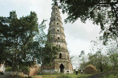 貴港市城東五里的羅泊灣,形如蘿卜,因而原名蘿卜灣。灣上有一座巍峨古塔,名曰安瀾,又曰漪瀾,塔高九層約30多米,底層周長36.62米,墻厚1.9米,塔身呈八角形,共有35個(gè)形狀不同的窗口,坐南向北臨江而立,建筑風(fēng)格非常獨(dú)特。此塔建于清嘉慶二十三年(1818),已經(jīng)有200多年。昔日登塔可望江城,江中百舸爭流,浪擊飛舟,城上高樓林立,車水馬龍,人來人往,無限風(fēng)光在塔峰。此塔遭受過無數(shù)次特大洪水的沖撞和雷電轟擊,仍巋然不動(dòng),穩(wěn)如泰山,塔頂?shù)耐咂坏袈,塔身沒有毀損,保留全貌。
