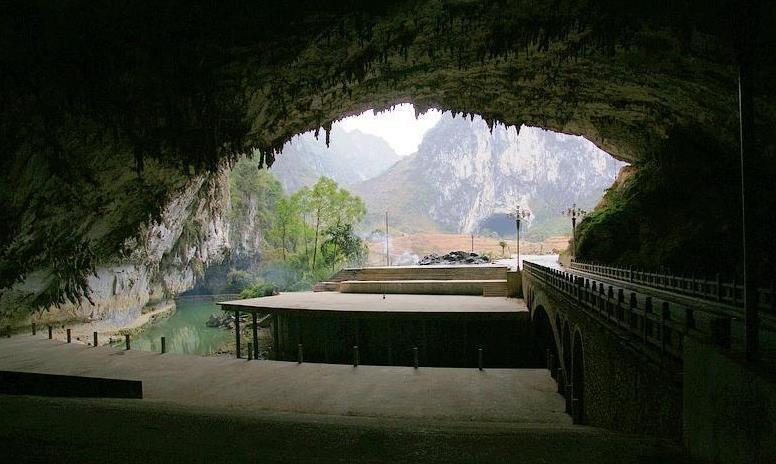 穿龍巖,位于縣城內(nèi)西北面,因其古時(shí)候?yàn)槁啡瞬叫腥氤堑谋亟?jīng)之道而又名鳳陽(yáng)關(guān)。其西南面石壁高約180m,130m處有一小溶洞,被稱作鳳山的“鳳眼”,夕陽(yáng)晚照,滿壁金光,為鳳山八景之一“丹崖晚照”。穿龍巖南面洞口寬約80m,高約30m,其中河床寬約20m。整個(gè)穿龍巖最寬約200m(含河床寬度),深度為400m,最高高度約100m,洞廳面積4.15萬(wàn)平方米,排名中國(guó)第五。