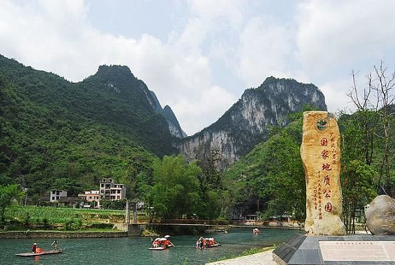 廣西樂(lè)業(yè)-鳳山世界地質(zhì)公園,位于廣西西北部云貴高原向廣西盆地過(guò)渡的斜坡地帶,由百色市樂(lè)業(yè)大石圍天坑群國(guó)家地質(zhì)公園和鳳山巖溶國(guó)家地質(zhì)公園組成,總面積930平方千米。現(xiàn)已發(fā)現(xiàn)大小天坑30個(gè),是世界上最大的天坑群之一。地質(zhì)公園區(qū)中鳳山三門海景區(qū)擁有高穴馬王洞和水上天坑等地質(zhì)遺跡。天坑群中以大石圍天坑規(guī)模最大,深度和容積居世界第二;坑底森林面積10.5 萬(wàn)平方米。