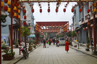 繡球風(fēng)情街依河而建,是舊州古城里最古老、同時(shí)也是當(dāng)?shù)匕傩罩谱骼C球最為集中的一條街。整條街道上方火紅的燈籠組陣排布,寓意“鴻運(yùn)當(dāng)頭”。每逢農(nóng)閑日子,舊州古城滿街都是坐在門口縫制繡球。在這里,老式的磚瓦房,斑駁的厚木門,滄桑的青石板路,以及心靈手巧的壯鄉(xiāng)手工藝人,無不彰顯著深厚的文化底蘊(yùn)。