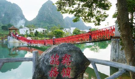 “情定舊州,霧鎖鵲橋”的典故源于“水?dāng)r火焰峰”的民間傳說——相傳,舊州古時(shí)候有一座老藤橋,是村民外出勞作的必經(jīng)之路,常有喜鵲聚集在兩旁的樹上嬉鬧。