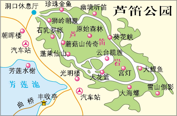 “桂林山水甲天下,蘆笛美景堪最佳!碧J笛巖是桂林山水一顆璀璨的明珠,蘆笛巖位于光明山南側(cè)山腰,洞深240米,游程近500米,是一處景致高度集中、景物極盡造化的神奇游覽佳境。在這個奇妙的巖洞中,琳瑯滿目的鐘乳石、石筍、石柱、石幔、石花擬人狀物,惟妙惟肖,構(gòu)成了三十多處景觀,有“紅羅寶帳”、“高峽飛瀑”、“盤龍寶塔”、“原始森林”、“簾外云山”、“水晶宮”等,可謂移步成景,步移景換。整個巖洞猶如一座用寶石、珊瑚、翡翠雕砌而成的宏偉、壯麗的地下宮殿。