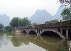 進入蘆笛景區(qū)首先見到的就是一座端莊古樸的石橋—飛鸞橋。飛鸞橋又名飛龍橋,位于桃花江與蘆笛路相交處。臨桂縣志載,宋紹定年間(1228-1233)建有5孔石橋,稱飛龍橋。明清均重修。雍正6年(1728年)邕人于必勝等捐資修建,有碑記。1941年秋毀于戰(zhàn)火。1944年地方人士募得糙米400余擔(dān),重修成木板面橋。開發(fā)蘆笛巖后,于1964年改建成3孔石拱橋,1967年4月建成,同年5月驗收通車,當(dāng)時稱“工農(nóng)橋”。