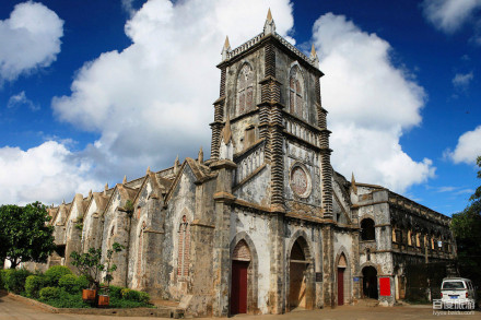 圣堂景區(qū)位于潿洲島盛塘村,是全國重點(diǎn)文物保護(hù)單位,“晚清四大天主教堂”之一。教堂由法國巴黎外方傳教士建于1853年,歷時(shí)10年建成,主體建筑保存較為完好,是中西文化融合共生的歷史見證。整座建筑主要取材于海底珊瑚沉積巖,運(yùn)用周密的力學(xué)設(shè)計(jì)建成,是典型的文藝復(fù)興時(shí)期法國哥特式教堂,外表高聳的羅馬式尖塔有著“向天一擊”的動(dòng)勢,造成一種“天國神秘”的幻覺,堪稱別具一格。