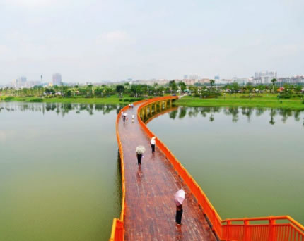 梧州園博園的整體景觀結(jié)構(gòu)為“一軸九片區(qū),三廊多節(jié)點”。一軸,指的是西入口的入園景觀軸,從西入口的龍湖大道開始,經(jīng)由跨湖橋一直延伸到東部山體;九片區(qū),是指沿著蒼海湖的東西兩岸,帶狀分布的原始地貌各異的九大片區(qū),分別為西岸濱水景觀區(qū)、水岸林舍片區(qū),蒼海公園片區(qū)等;三廊,指的市西岸親水綠廊,東岸濱水游憩體驗區(qū),以及核心城市展示廊。而多個各具特色的景觀節(jié)點,將有如明珠般分布在園博園各處,分別展示梧州的歷史文化、風土人情,充分體現(xiàn)“西江明珠,嶺南新韻”的主題。