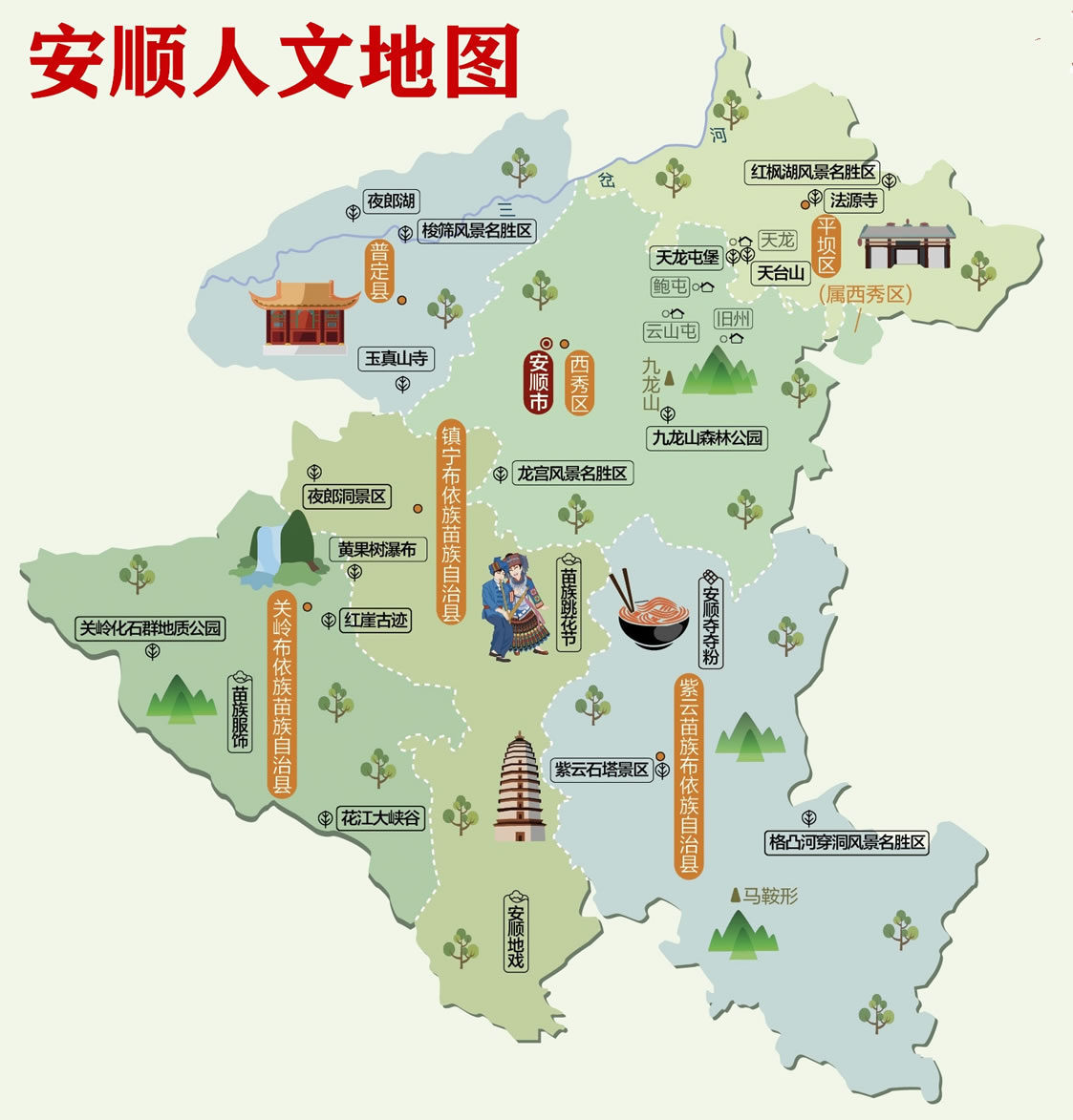 地區(qū)特產(chǎn): 蠟染、布依地毯、地戲面具、石刻藝術(shù)品、安順三刀、安順麻餅、鎮(zhèn)寧波波糖、舊州辣子雞、牛肉干、安順山藥等。