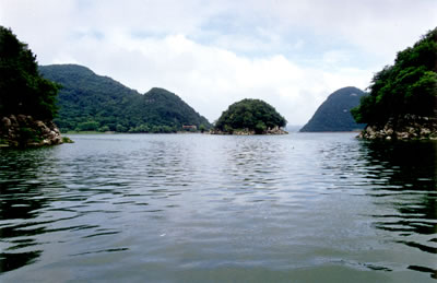 南湖的面積最大,景點也最多,南湖以洞多洞奇揚名。首先映入眼簾的,是一組奇目的山巖壁石,這是小巧瓏朗而又天然形成的“盆景山”。這里的石頭色彩特別豐富,青灰和棕黃的頁巖直插入碧水之中。大湖面逐漸狹窄,這兩邊的巖岸,如同斧劈劍削,有些游人把它呼為“小三峽”;這一片景觀石峰林立,如同到插的刀劍,給秀美的湖水增添幾許陽剛之氣,人們把它稱為“小石林”;這里的巖石,別有風姿,它橫看不成嶺,側(cè)看不成峰,一片又一片向上堆積,有如卷幟浩繁的典籍,人們把它稱為“峭壁天書”。