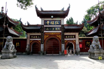 弘福寺為全國重點開放寺廟之一。清康熙十一年(1672年)由赤松和尚創(chuàng)建。“弘!倍帜恕昂敕鸫笤,救人求世,福我眾生,善始善終”之意。沿九曲徑,經(jīng)二十四拐,可抵達弘福寺。弘福寺主要建筑有法化塔、九龍壁、大山門、鐘鼓樓、天王殿、觀音殿、大雄寶殿、玉佛殿、藏經(jīng)樓、說法堂、客堂、雙桂樓及方丈苑;有碑廊、素香齋、五觀堂和五百羅漢堂等大小建筑72座,加上放生池與茶樓等處,占地近11433平方米。徑旁摩崖石刻不絕,其中“虎”字高6米余,題名岱山趙德昌書,實為清著名書畫家孫清彥(竹雅)代筆。寺后象王嶺望城臺上(海拔1270米),建有“瞰筑亭”(1986年春劉海粟大師親書)。
