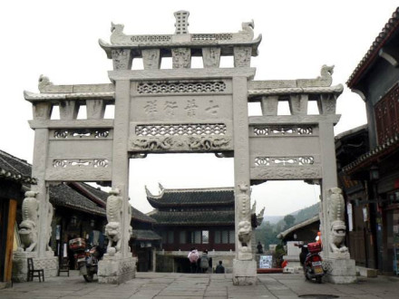青巖古鎮(zhèn)城中原有八座牌坊橫跨在石板鋪筑的大街上,如今尚存兩座百歲坊和一座貞節(jié)牌坊。定廣門(mén)內(nèi)的趙理倫百歲坊,是清道光二十三年(1843年)奉旨建造的。它是一座四柱三間、三樓四阿頂?shù)氖品,?.5米,寬約9米。精心雕琢的石牌坊,在藍(lán)天白云之中,顯得空靈。正中的橫額上,鐫刻著道光皇帝的題額,正面是“七葉衍祥”,背面是“升平人瑞”,上端有“欽賜”二字。抱柱的四對(duì)石獅子非同尋常,不是站獅,也不是臥獅或蹲獅。八頭獅子仿佛是從高山上俯沖下來(lái),富有靈性。