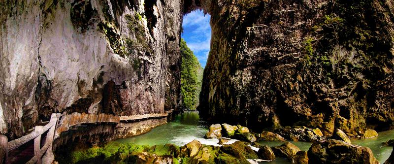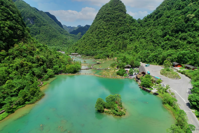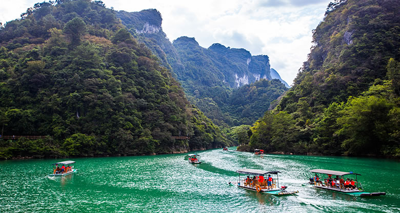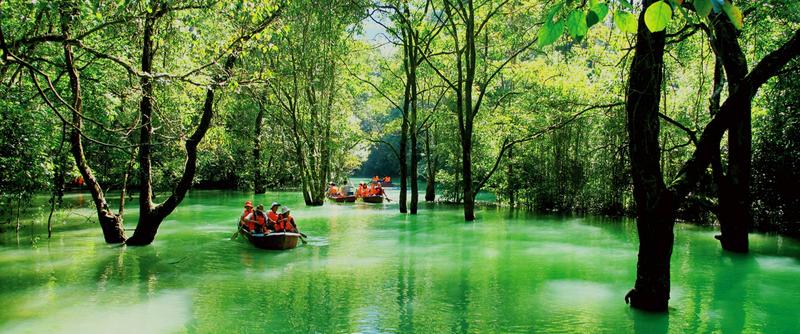 乘橡皮舟順?biāo)従彾,兩岸是蔥茸秀麗的喀斯特原始植被,幽靜的河水中,時(shí)而有魚兒躍起,時(shí)而有秀美島嶼出現(xiàn),宛如精巧的天然盆景。山水含情天做媒,帶著情侶竊竊私語,帶著老伴同舟共濟(jì),帶著朋友戲水歡歌。
